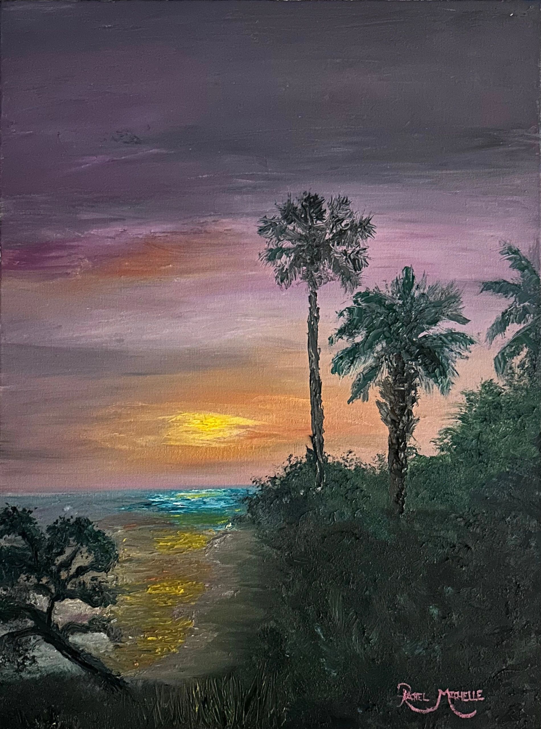 Transport yourself to the tranquil shores of the Sunshine State with Florida Twilight by Rachel Michelle. This 18 x 24-inch oil painting captures the magic of a Florida sunset, where soft purple and rose-hued clouds stretch across the sky as the sun dips low over the shimmering ocean. Lush palm trees and coastal foliage frame the luminous scene, evoking the gentle warmth and timeless peace of twilight along Florida’s coast. Let this serene seascape be your daily reminder of nature’s quiet wonders.